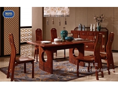 书柜主体材料采用缅甸进口的大果紫檀,厚实的桌面用料都是采用的大料平板而成,餐椅靠背流线造型选用整料画线掏出。