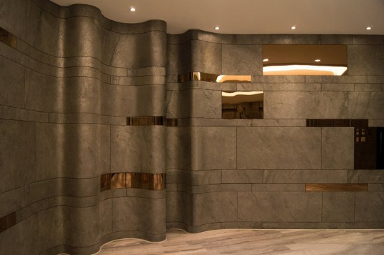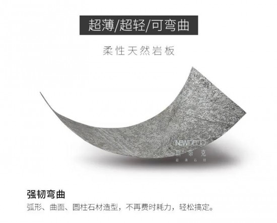 成品厚度1-3mm,每平米重量约1.5kg左右,其产品具有天然石材质感,超轻,超薄,强韧可弯曲,可透光等特点,最大限度提升石材利用率,为节省能源,降低运输与安装消耗做出巨大贡献,不但改变了多年来使用粗石材的历史,更因其独特的自然纹理,超强的任性和可进行极限弯曲的特性,为石材装饰创造了更多的可能性。