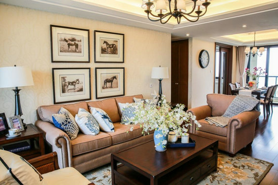 软装过程中,色彩搭配决定了居室整体气质。美式风格倾向于沉稳的浓色,如咖啡色、深桃花芯色,来奠定优雅基调。对中小户型而言,设计师点缀蓝、白、绿、黄、粉等活力色彩,利用靠垫、摆件、花瓶等潮流单品,中和家具基调,能为中小空间带来一份轻盈。