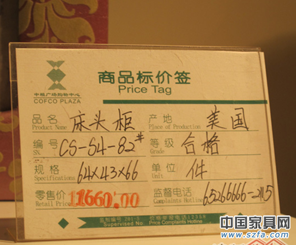 根据《上海家具行业产品三包责任规则》指出:标价应有中文标明产品名称、型号、产地、厂名、经销商或进口代理商名、等级、计价单位、规格、基辅料等标识。但记者发现中粮广场入驻进口品牌中天龙八部,大部分标签上只有品名、产地、编号、等级、规格、单位、零售价、监督电话这八项。其中,少部分商家用黑色铅字笔在标签右上方手写标明材质。