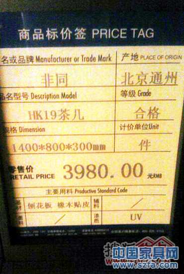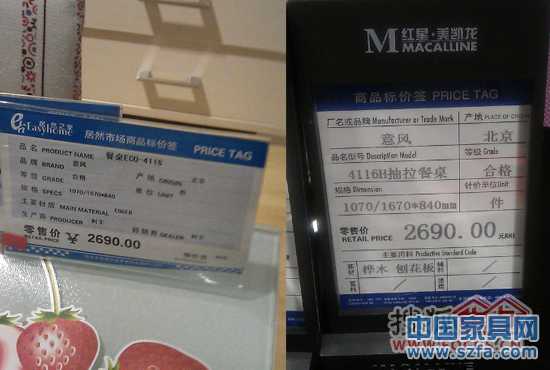 同品牌同款产品在居然之家、红星美凯龙的价签