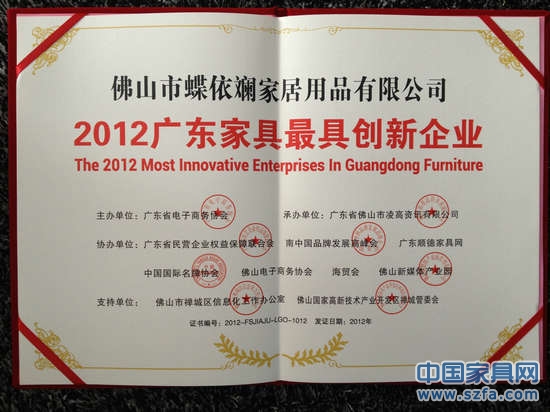 2012年12月28日,由广东省电子商务协会举办的,广东家具行业创新颁奖典礼在佛山举行。数百家业内代表企业精英齐聚,共襄盛举。佛山市蝶依斓家居用品有限公司荣获2012广东家具最具创新企业殊荣。