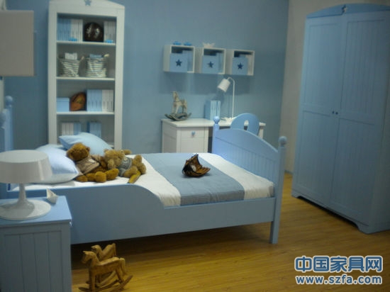 浅蓝色和白色格调,打造出一款静谧温馨的儿童套房组合。海风轻轻吹,海浪轻轻摇,小小水手正在进入梦乡。