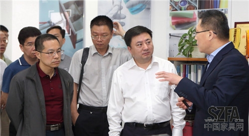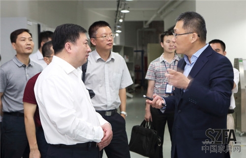 坪山新区领导刘胜副主任(左)、吴德林主任(中)在侯克鹏会长(右)陪同下考察深家协家具研发部