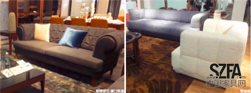 各品牌的布艺沙发主体色继续延续去年的安全色,而靠包会使用彩色或花纹图案,并且坐垫边缘的滚边会以彩色进行勾勒。这样的配色,既保证了沙发在客厅空间不会过于跳跃,又能增添一些活跃的气氛。与此同时,不同部位使用不同色彩的材料,则对沙发制作的工艺提出了较高的要求。