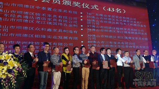 佛山市家具行业协会左伯杨常务理事长、周卫新监事长为优秀会员企业颁奖