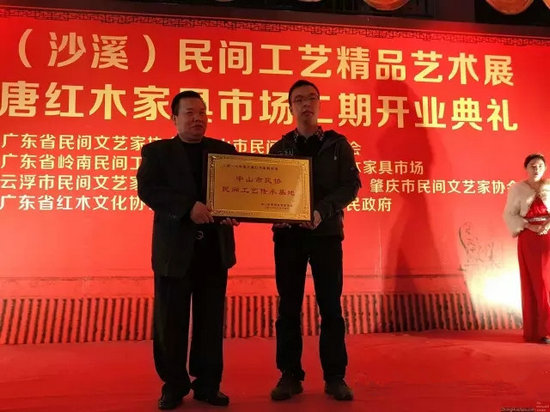 承载更多使命与责任,中山市民间工艺传承基地落户大唐红木家具市场!由中山市民协主席李桂山向大唐红木家具市场副总经理方君明授予牌匾。