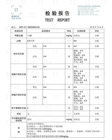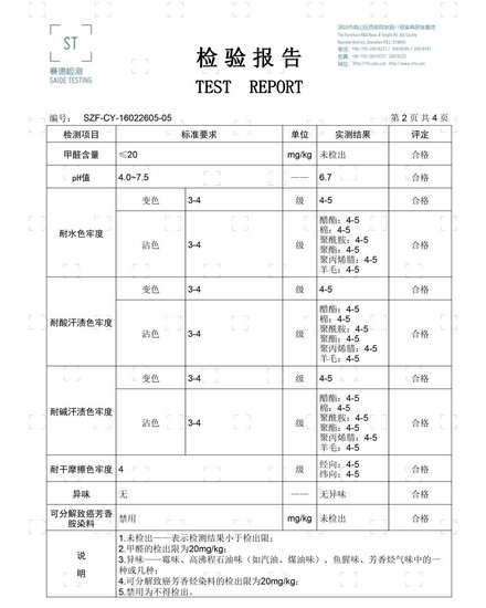 ③面料:异味、pH值、耐水色牢度、耐酸汗渍色牢度、耐碱汗渍色牢度、耐干摩擦色牢度、可分解致癌芳香胺染料、甲醛含量。