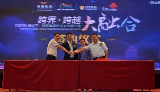 (左起)中国联通、苏宁易购、简爱家居、富元集团战略联盟签约仪式