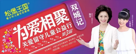 由中国文学艺术基金会主办、松堡王国承办的“为爱相聚•双城记” 大型关爱留守儿童公益行于今夏盛大开启。自7月16日至7月31日将接受爱心小天使的报名,届时将从深圳、合肥、南昌、苏州、石家庄五座城市选拔出的爱心小天使与我们共同前往江西瑞金关爱留守儿童。选出来的家庭由松堡王国全程承担行程费用,同中国文学艺术基金会、明星组成爱心天使团前往江西瑞金慰问留守儿童,并进行三天四夜的寻爱之旅,此次活动旨在呼吁更多社会人士关注留守儿童,让他们感受到社会的温暖,让他们感受到爱从未离开!