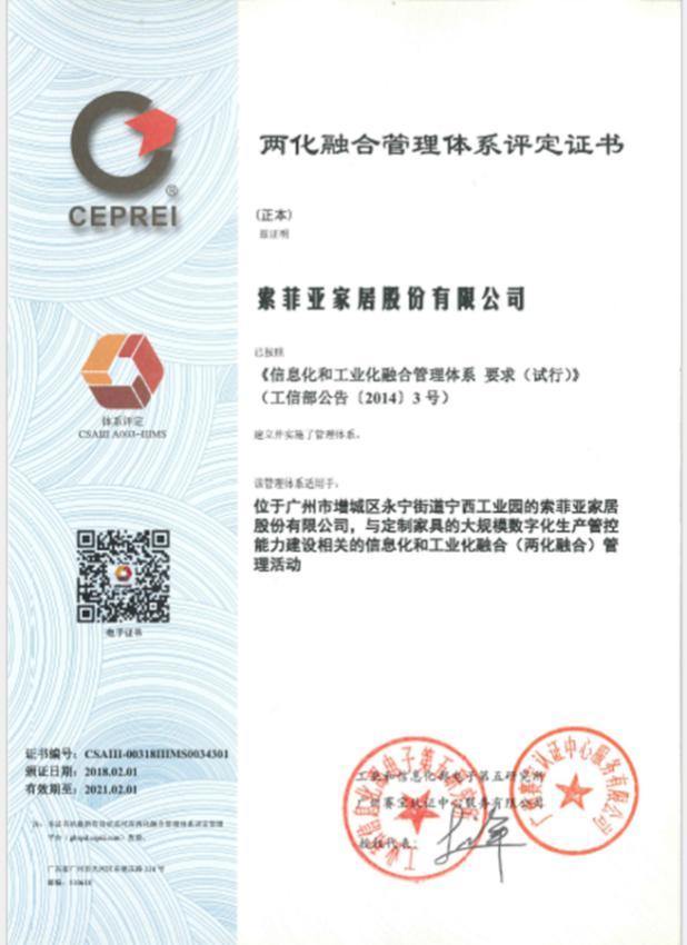 2018年2月,索菲亚家居股份有限公司成功通过了两化融合管理体系国家工信部专家组的审查复核,获得了由工信部电子第五研究所颁发的“两化融合管理体系评定证书”, 成为定制家具行业中率先通过两化融合评定的企业。