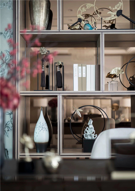 餐厅延续着清雅的灰白设调,沉稳的苋红色与清新的冷绿组合,为静婉的空间蕴育一种稳而不沉的生动韵味。背景墙上的植物花鸟藤蔓,勾勒一个灵动、雅致的空间意境,为每日的用餐时光增添趣味和舒然。