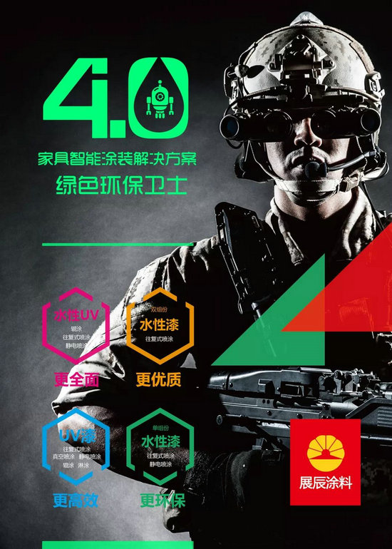 今年3月份,展辰涂料推出“智能涂装4.0绿色环保卫士”环保涂装理念与解决方案,这一理念和应用的推出给家具企业带来了前所未有的涂装体验,其更全面、更高效、更优质、更环保等优势很好地解决了目前家具企业普遍关心的环保、品质、效益、效率等问题。