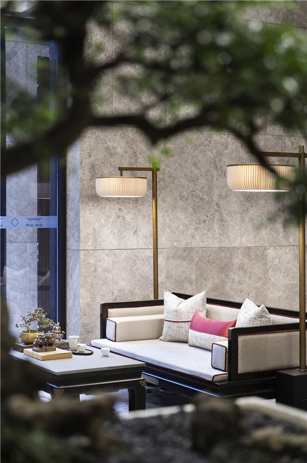 禅茶室中,当地竹编天花衔接形制各异的手作竹制灯饰,铺展开一室古雅清惬。以旧瓦堆叠的墙面带着岁月的纹路,斑驳光影点染老木头细雕双龙、花木的窗棂,万里江山图与透明山石小景的虚实映衬,丰盈了这份古典况味。