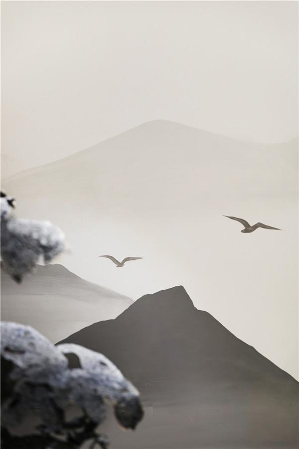 移步下阶,见水墨山川顺沿蜿蜒周折的楼梯走势,盘旋错落。云雾缥缈间,红枫叶落,劲松苍翠,山峦叠嶂,意境雅隽。山石与苍松的精巧端景,映衬着山水画的意境,人文自然的隐逸美散落在虚实之间,自在由心。