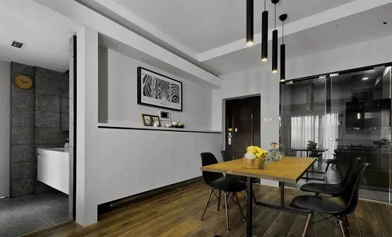 简约的一字型电视柜除了放在客厅,也同样适用于卧室、玄关和厨房,不一定必须要放电视,做一个玄关边柜或厨房的橱柜都合适。柜子的内部可放杂物、小件,关闭后呈现一个整体,没有一丝多余。