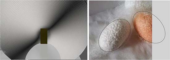 设计师从“作茧自缚”到“羽化成蝶”这一设计师的经历过程出发,装置设计提取茧的型体,并加入中山古镇原产的灯光技术,以此带领每个人“域见粤T”。