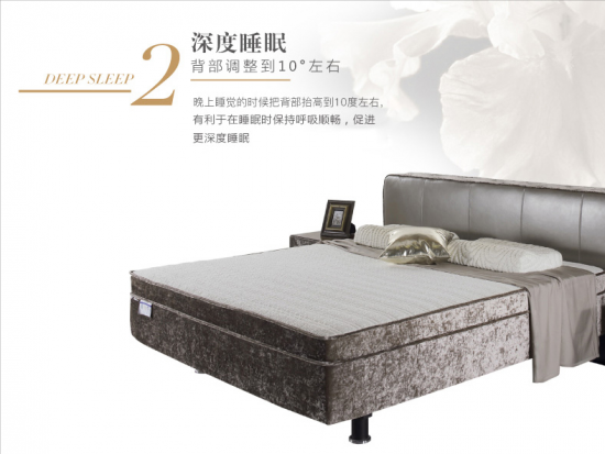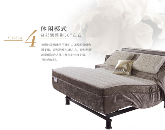 路福S301配备了两个德国OKIN电机,背部最高可抬升60°,腿部可抬升至40°,可以满足多种躺卧姿势,满足不同的需求,如阅读、看电视、办公、打鼾干预等。