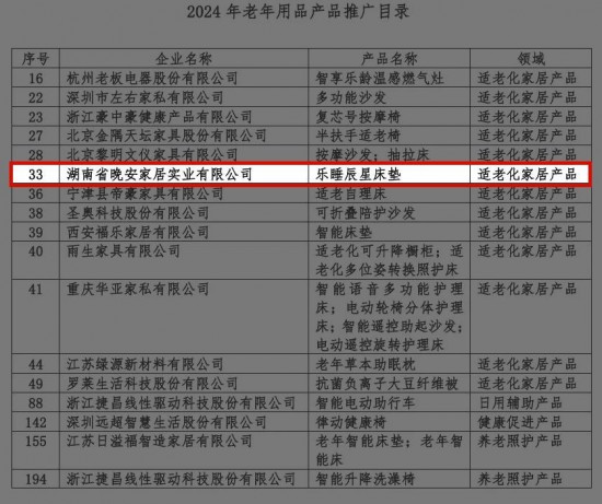 近两年来,工信部持续推出系列举措,加快适老化产品创新,拓宽银发经济发展空间,组织开展了老年用品产品推广目录申报工作。日前,工业和信息化部公布《2024年老年用品产品推广目录》,中国家具协会十六家协会会员企业产品名列其中,其中晚安家居“乐睡辰星床垫”成功入选,作为中国家具协会副理事长单位,为引导行业高质量发展,树立了示范典型。