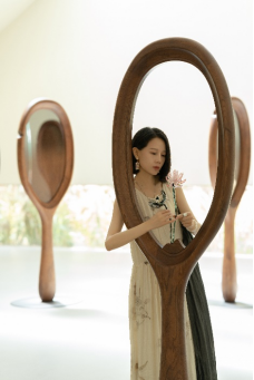 她设计了十二枚镜面,构成一个椭圆形装置,象征生命的循环往复与时间的永恒流动。每一枚镜子背后展示了对应月份的花卉,象征自然界的变化与生命的节奏。镜面采用了特别定制的幽灵镜效果,具有渐变的反射能力;使观众在镜前不仅能看到自己的倒影,还能模糊地感知到背景中的年轮图案。这种交互效果使得观众的身影与自然的纹理相融合,增强了人与自然的连接感。观众可以在镜面之间随意走动,观察不同镜面的花卉与自己的倒影,与时间对话,回顾过去、审视现在并展望未来。