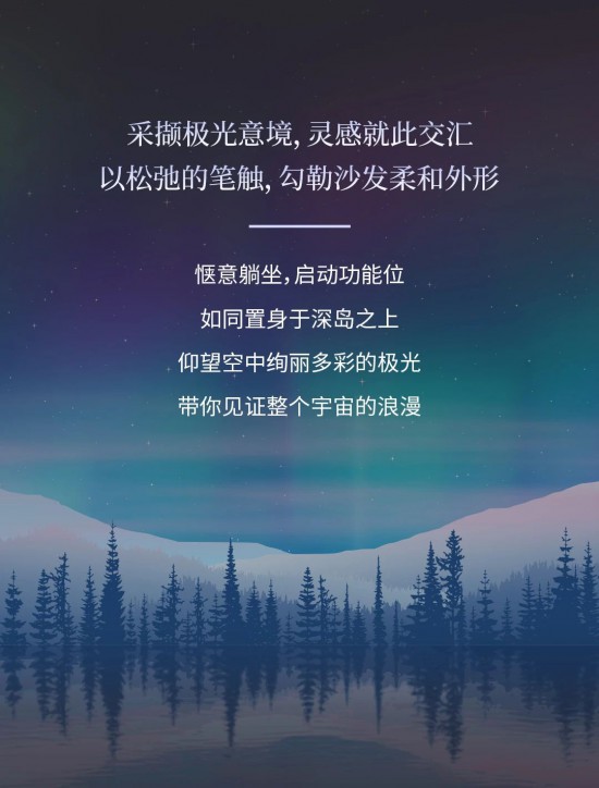 核心提示:惬意躺坐,启动功能位,如同置身于深岛之上,仰望空中绚丽多彩的极光,带你见证整个宇宙的浪漫。