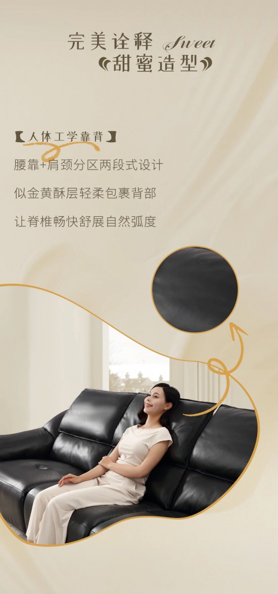 核心提示:人体工学靠背,腰靠+肩颈分区两段式设计,似金黄酥层轻柔包裹背部,让脊椎畅快舒展自然弧度。