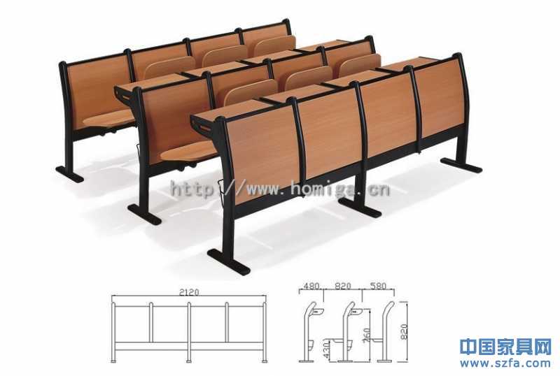 1)椅座:基材采用优质多层热压成型板,面压榉木色防火板,板面为光面,厚度达15mm, 切面PVC封边。座椅可回弹复位。