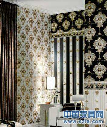 局部拥有金属光泽的壁纸,繁复典雅,华丽而复古,坐在家里也能感受高贵的宫廷氛围,在现代款台灯与水晶高脚杯的映衬下,壁纸的金色纹理更加亮丽夺目,昭示着现代人对奢华生活的追求,白色家具与地板则很好地平衡了壁纸的奢华与闪亮。