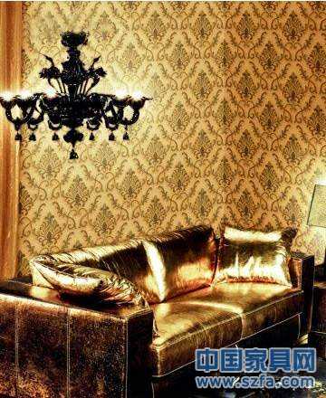 金光闪闪的现代沙发和窗帘给人以冷艳的视觉冲击,在这样张扬的氛围中,同一色系的暗金色壁纸却又不失内敛。壁纸图案的繁琐与现代家居的简约雅致在矛盾中依然相得益彰,优势互补,让待客空间在迎接贵宾时依然落落大方。