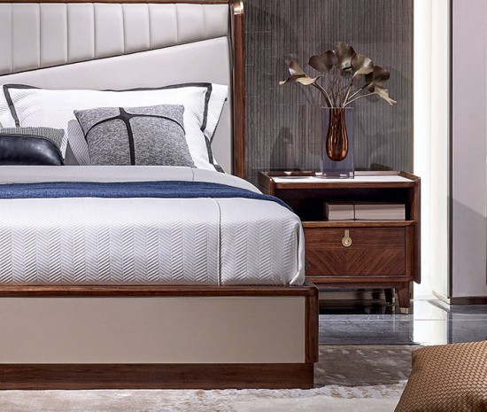 整体空间霸气十足又不失典雅,展现宽阔坦荡的胸怀和无拘无束的生活状态。床身稳重厚实,床头落落大方,时尚与高雅不言而喻。