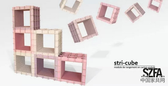 Stri-cube是用瓦楞纸做的模块化书架。拥有一定厚度的瓦楞纸板,通过有趣的插接结构,可以搭建出一个立体的储纳家具,不需要任何胶水或者五金连接件。像是一套玩具,由使用者亲自动手完成安装,童趣、环保且实用。