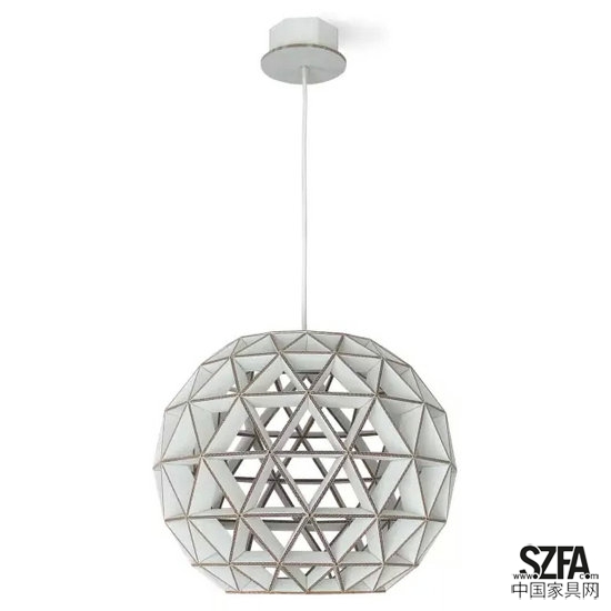 同样用瓦楞纸插接而成的一款灯具。灯光通过三角拼接的纸质灯罩投射下漂亮的阴影,白色的饰面与瓦楞纸咖色的截断面搭配起来十分简洁干净。
