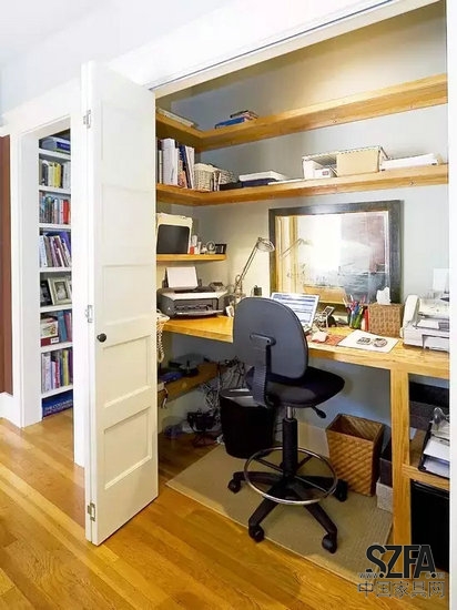 在家里的拐角处,依靠墙设计壁桌和壁柜造就舒适简约的双人办公区。在过道的凹处,起到了很好的隔离作用。