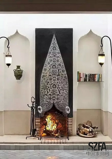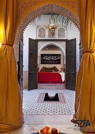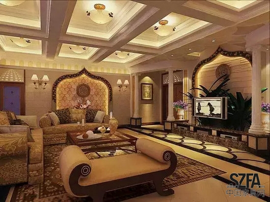 伊斯兰装修风格的特征是东西合璧,室内色彩跳跃、对比华丽。表面装饰通常突出粉画,彩色玻璃面砖镶嵌。最常见的是用雕花、透雕的板材作栏板,门窗常用石膏浮雕作装饰。