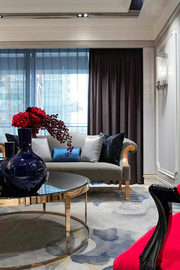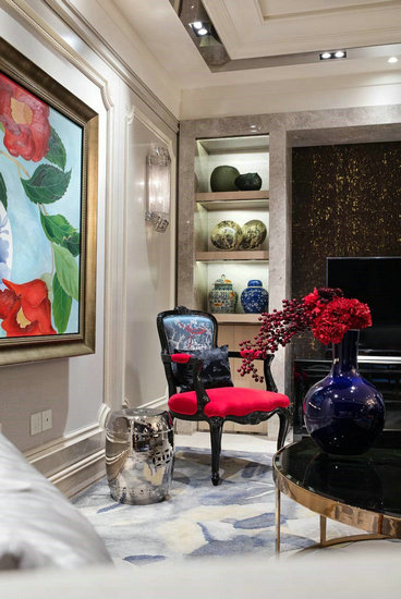 另一处亮点是存在于卧室中华美的景泰蓝茶具以及如墨色般的帷幔,与金银艺术品相搭配,点缀如海如晴的自由奔放,在波光潋滟中呼之欲出的,是对美好生活的向往。