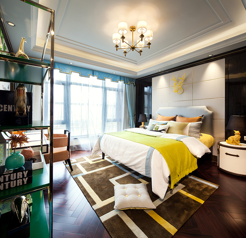 在二楼的空间,设置有主人房、书房、小会议厅、健身室、棋牌室、客房等空间。而设计师顺应了别墅主人西式的生活习惯,并又热爱中式传统文化的信仰,采用简欧风格大床搭配具有弧形线条的沙发和简约的柜子,配上祥云的挂画、陶瓷摆件、水墨山画地毯表达出主人享受现代生活的乐趣的同时也追求传统文化。客房设计关照居者对生活广而大的需求,以欧式简约与现代中式的风格为基础环境,利用床上用品、挂件、柜地毯的色彩来实现不同区域的区分,呈现空间丰沛的美学力量。