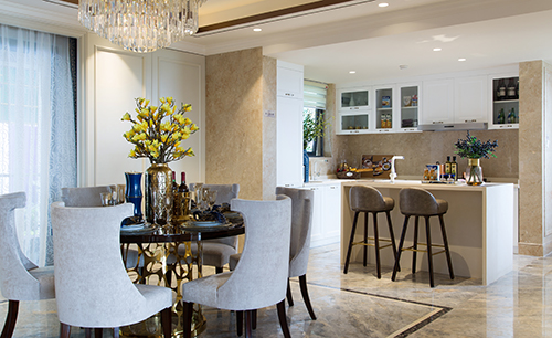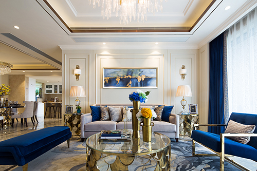 在这套206平米的空间中个,4房2厅3卫4阳台加入户花园,墅级尊崇尺度,三大独立起居室确实让人惊艳一番。整体简约的欧式家具配以蓝色系软装,以硬朗的材质和明快的色调、雅致的配饰,赋予空间沉稳,典雅,轻松的神采。本方案力求简约,自然,随意的笔触演绎简欧风格的大气与和谐。