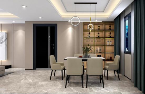 CBD家居·白金 | BJ190餐桌,劳伦白金岩板+黑色喷砂桌脚支撑,形色简约纯粹,颇有设计感的入墙柜,置物收纳,呼应别具生活感的舒适日常。
