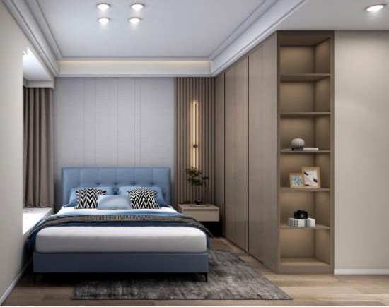 蓝色为空间注入静谧气韵,CBD家居·白金 | BS009软床放置一隅,飘窗设计恰到好处,小空间得到延展,更显舒适休闲。格栅背景板与定制柜相呼应,色彩和谐,营造淡雅自然的睡眠氛围。